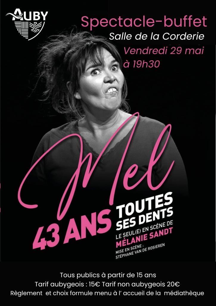 La municipalité, via son service culturel, vous propose une soirée pleine de rires avec “Mel, 43 ans et toutes ses dents”. Le vendredi 29 mai à 19h30 à la Salle de la Corderie.